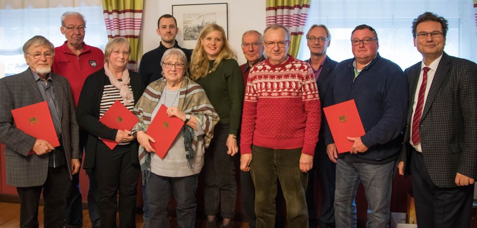 Die Urkunden nahmen entgegen: für 60jährige Mitgliedschaft Edgar Weber (stellvertretend sein Sohn Peter Weber); für 50jährige Mitgliedschaft Walfriede Baas, Heidrun Lang, Adolf Kimmel, Dieter Meissner und Ludwig Thiel; für 30jährige Mitgliedschaft Gerd Rauch; für 10jährige Mitgliedschaft Jan Geiser.